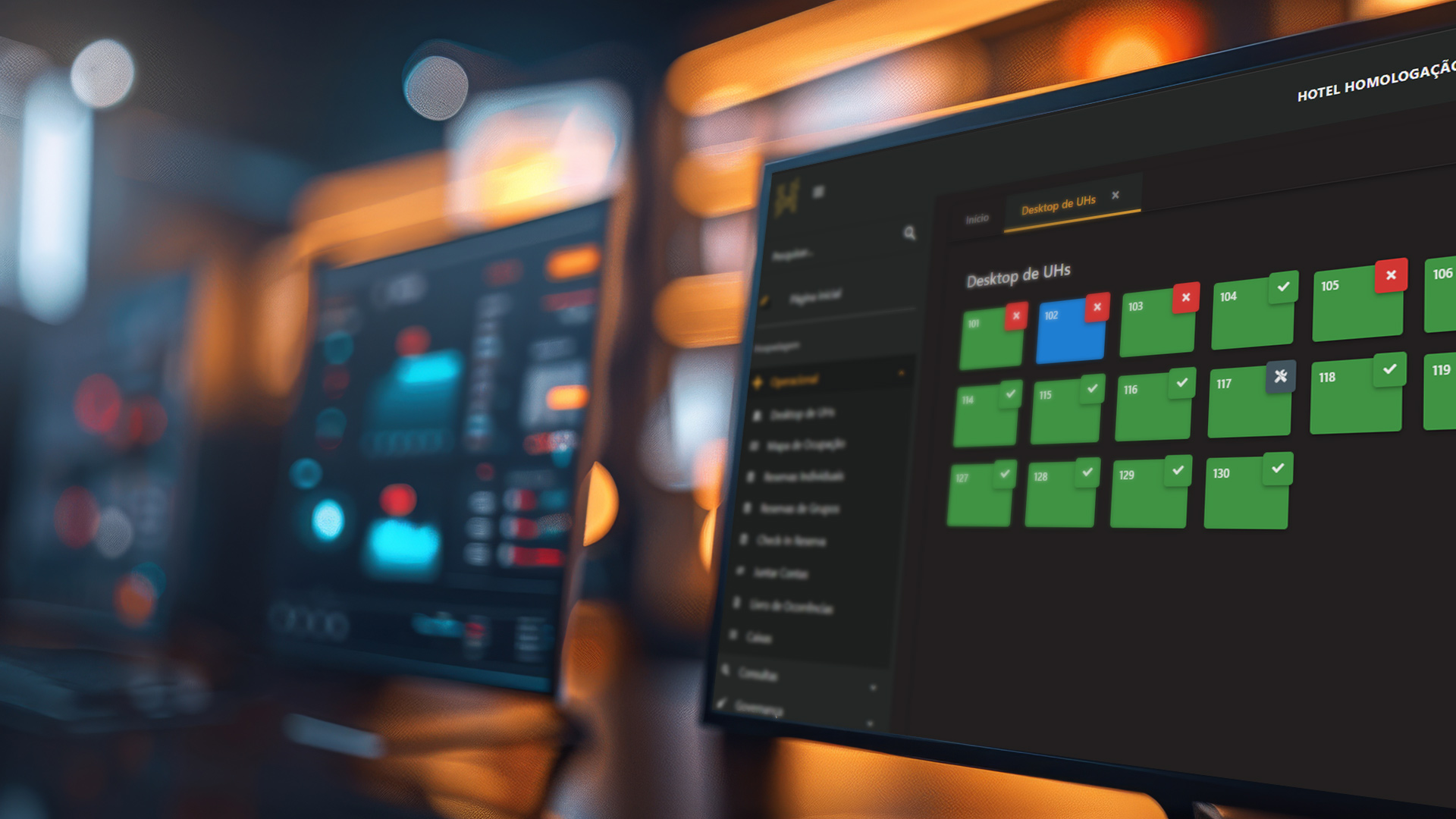 Com reservas, check-in, check-out, fechamento de caixa, relatórios, rotinas de governança.